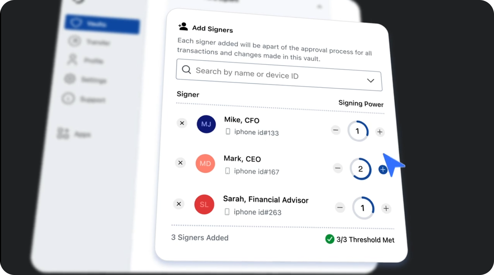 Unlimited vaults with segregated addresses, variable thresholds and weighted powers. Quickly configure and manage your team and setup directly in the platform.